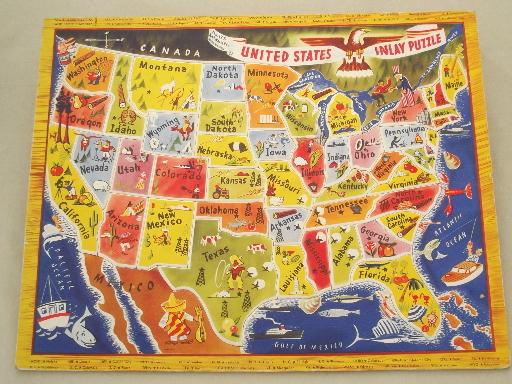 vintage color litho puzzle board, US map tray puzzle w/ die cut states